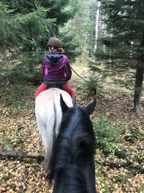 When Bengtsson was riding a fantastic stallion the horse was a bit spooky in the beginning. It was so interesting to follow how calm Roffe remained and how confidently he just sat in the saddle. Then he said what I have always believed is true. "Don't push the horse toward what it is afraid of. Slowly walk around it and get the horse used to the scary thing (in this case the dogs that were sitting around that one fence)." A lot of the times we see riders 'making' the horse go toward the scary thing rather than slowly getting the horse acquainted to it. That same week there was a real storm when I had my riding lesson with Thor. We went down to the indoor arena and the doors were flying open, the trees were whooshing outside and the horses were running around next to the arena outside in the field. I felt a bit insecure and stiffened up a bit. Luckily our trainer Tiina Rikkonen was there to support us and I had the image of Bengtsson riding the stallion in my mind. It really helped and not only did I have an alert horse but a very fantastic ride despite the storm.